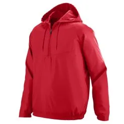 Outer shell of 100% matte micro polyester * Lined with 100% polyester taffeta * Woven label * Half-zip pullover style * Hood with drawcord on Adult sizes S-4XL only * Angled front yoke * Raglan sleeves for maximum mobility * Front seam pockets * Half-elastic cuffs * Open bottom with elastic at side seam * Water-resistant-