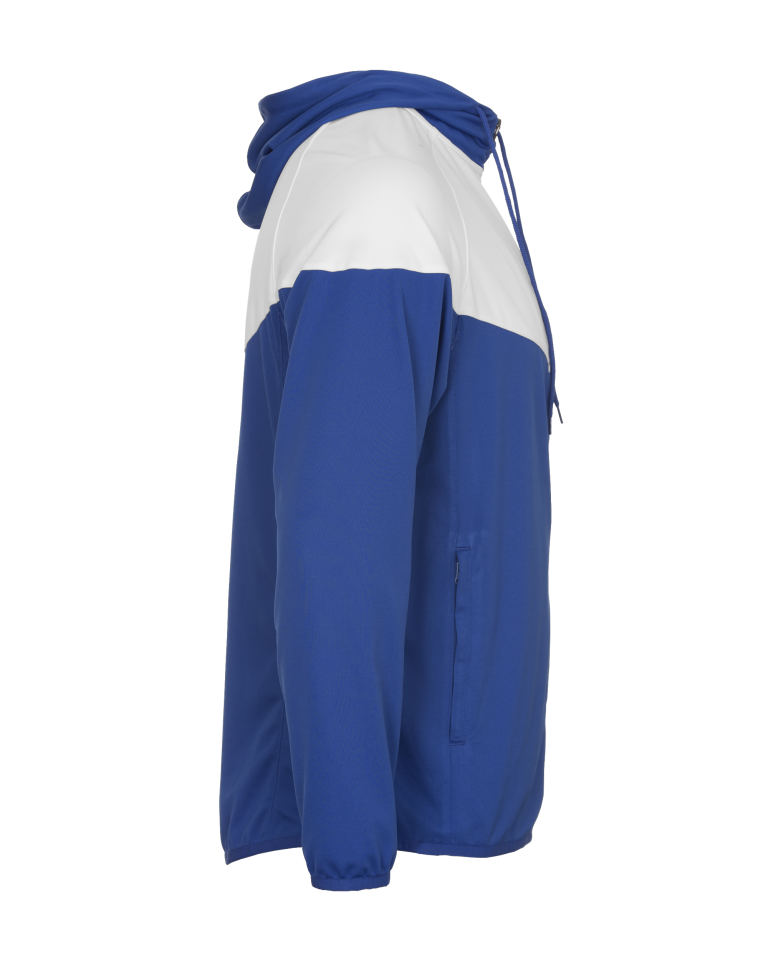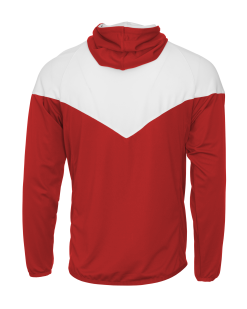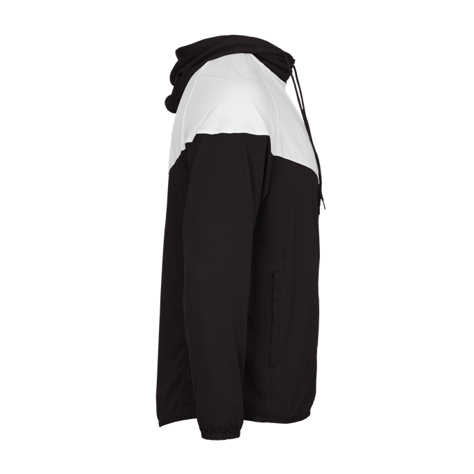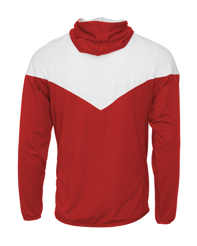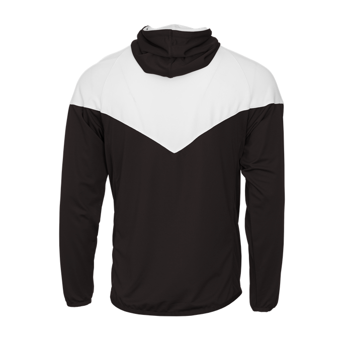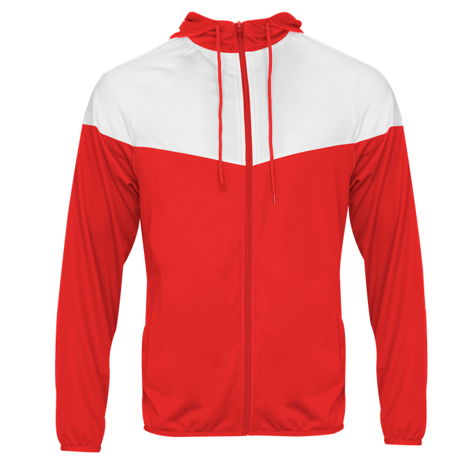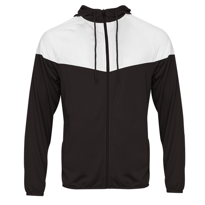 - Self-fabric hood with drawcord and full length locking zipper