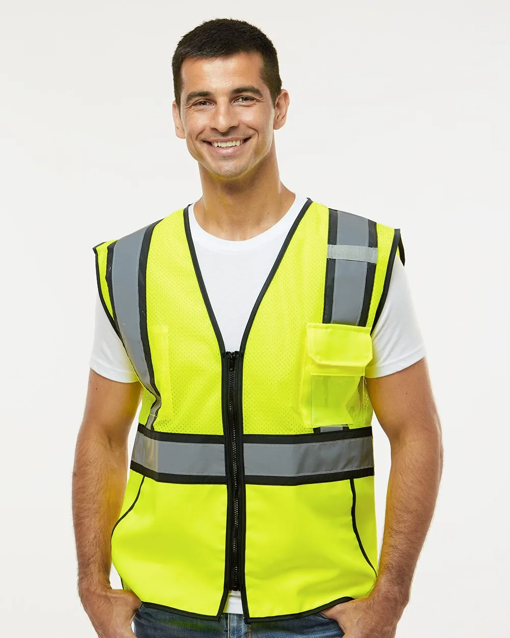 - Reflective colored trim on armholes, hem and pockets to keep you visible in the work zone