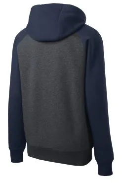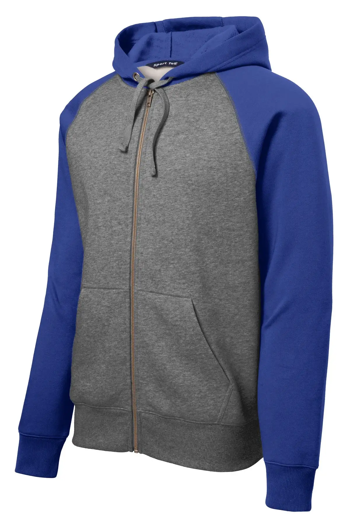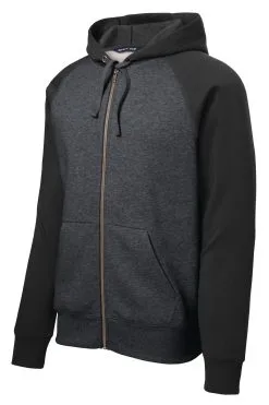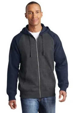An exposed zipper and contrast raglan sleeves give this shrink-resistant jacket a vintage look.
